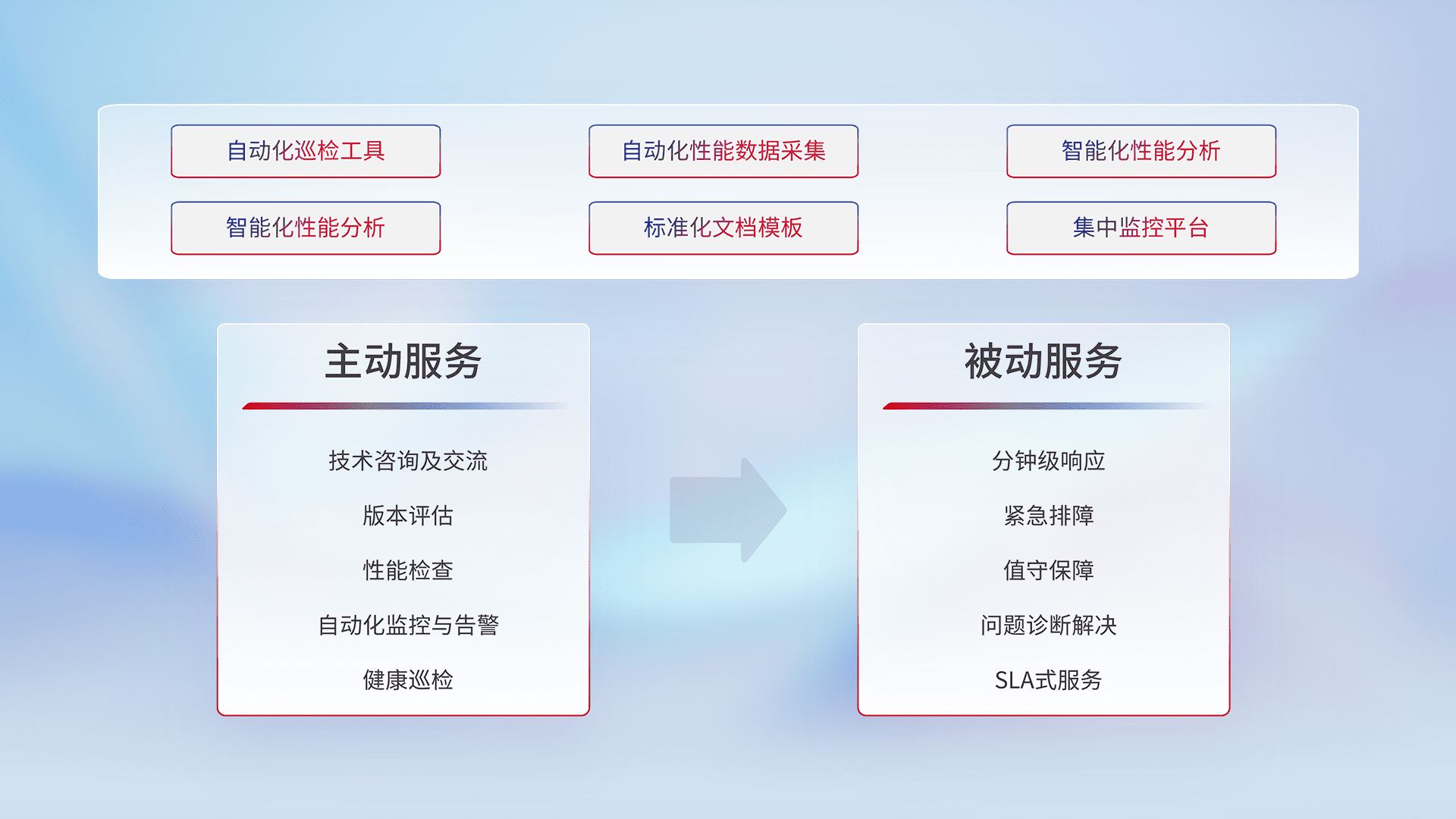 智能化工具和标准化文档,,,保障服务质量,,,,提供主动服务(包含技术咨询、、版本评估、、性能检查、、、、自动化监控与告警、、、、健康巡检)和被动服务包含(分钟级响应、、、紧急排障、、、、值守保障、、、、问题诊断解决、、、SLA服务)。。。