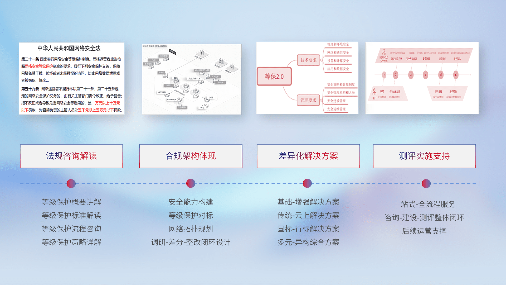 通过专业的法律咨询解读、、合规架构体现、、、、差异化解决方案、、、、测试实施支持等服务,,为客户量身打造等保合规体系。。。。