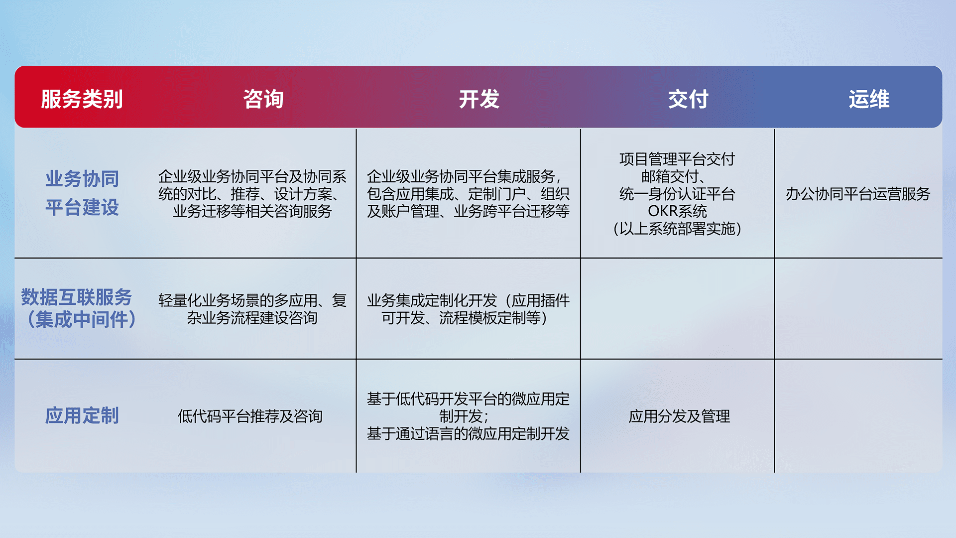 针对钉钉、、、、企微、、、、IDaas等平台级产品提供产品的规划、、、、方案、、交付、、、定制化开发等服务,,,,实现如统一协同办公、、智能客户服务、、、、混合会议管理、、、、智能数据查询、、等业务场景,,,实现数字化转型。。。。